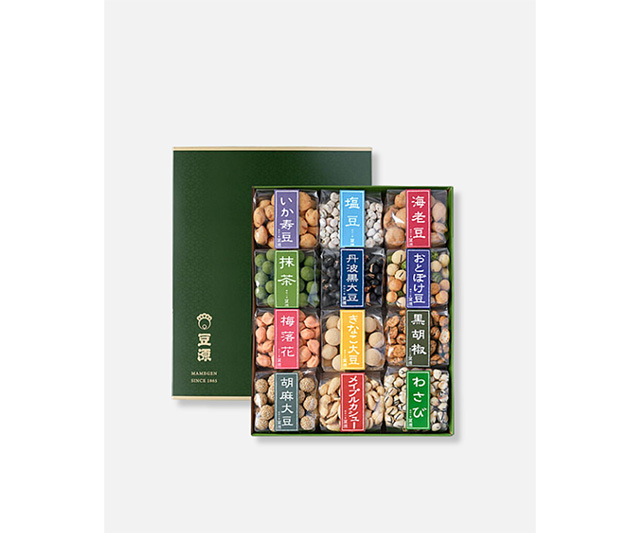 常時40〜50種は揃う<豆源>豆菓子の中から、12種類の豆菓子を存分に楽しめるギフトセット「風味一流」です。国産の黒豆をはじめメープルシロップ風味の豆菓子まで様々な豆菓子の味わいをお楽しみいただけます。
