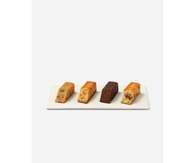 フルーツの食感が楽しめるように作ったベイクドケーキ。メイプルシュガー、ワインやブランデー、チョコレートなどの素材とフルーツを掛け合わせて4種類の味わいを作りました。リンゴメープル、マスカットレーズン、ホワイトフィグ、晩柑ショコラなど、ごろごろ入ったフルーツ、バターの芳醇な香りをお楽しみいただけます。
