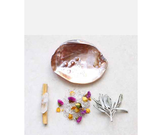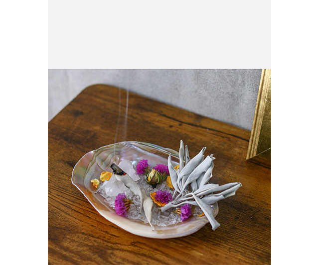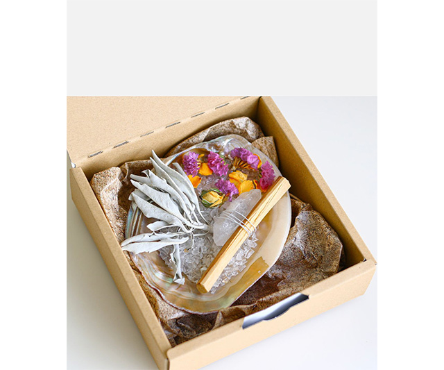- セージ、パロサント1本、ドライフラワー、シェル、クリスタル1個、さざれ石