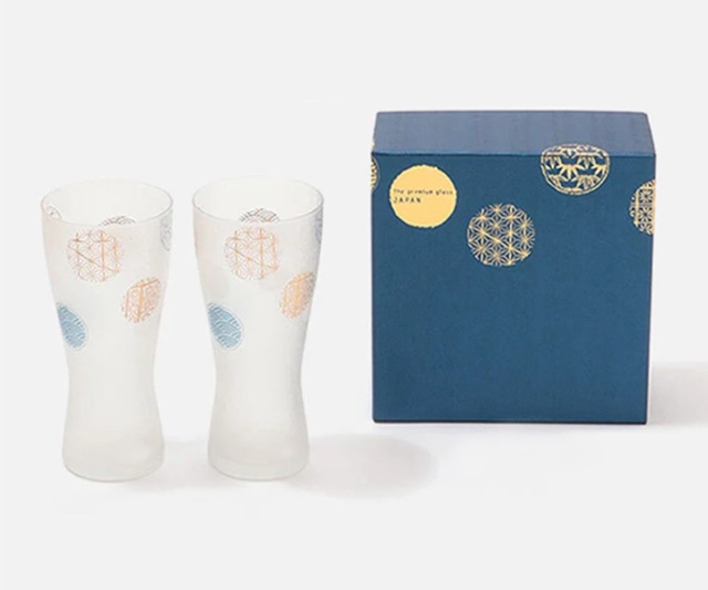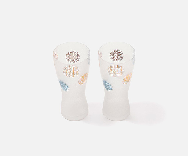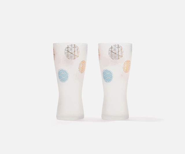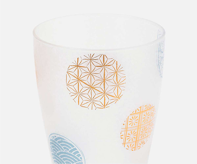 日本古来より親しまれてきた伝統の紋様を、縁起の良い丸紋にデザインしました。視覚からも清涼感を感じ取ることができ、金とブルーの丸紋を使うことで、高級感がありながら落ち着いた印象のグラスです。口当りの良い口部薄肉仕上げ。冷えたビールを注ぐと柔らかでクリーミーな泡の出来上がりです。