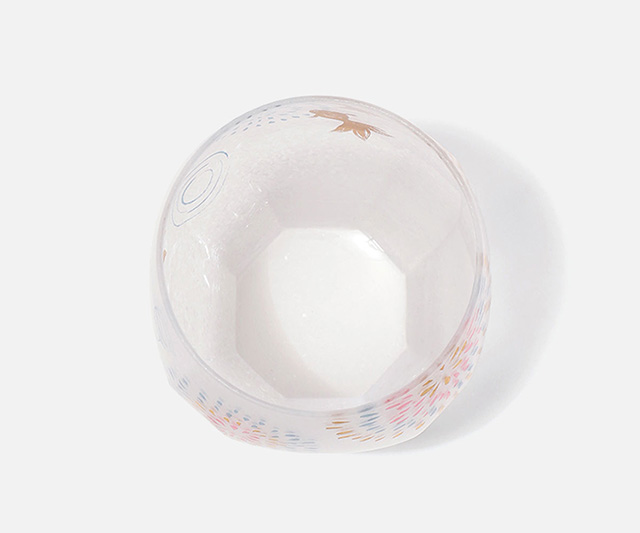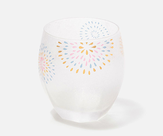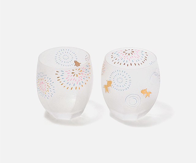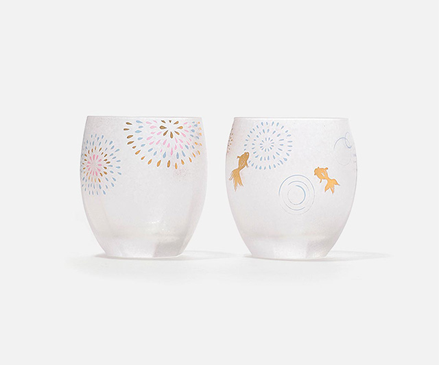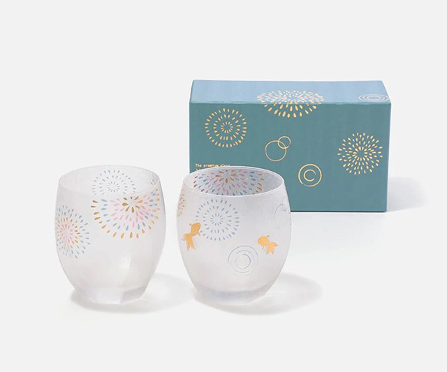 キラキラ煌めく水面に映る「花火」が金魚の作り出す水紋と重なる日本ならではの情緒が描かれたペアグラス。品よく涼しげな風合いで、口当りの良い口部薄肉仕上げの趣ある、あらゆるシーンで使いやすいオールドグラスです。