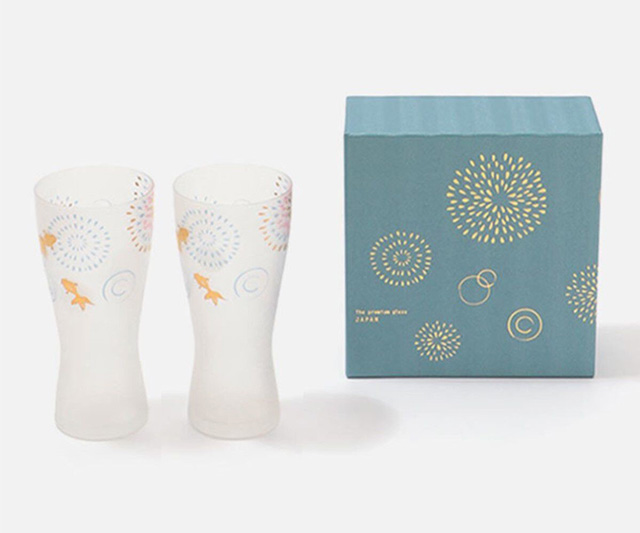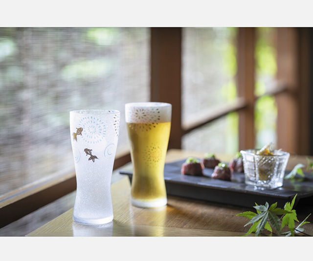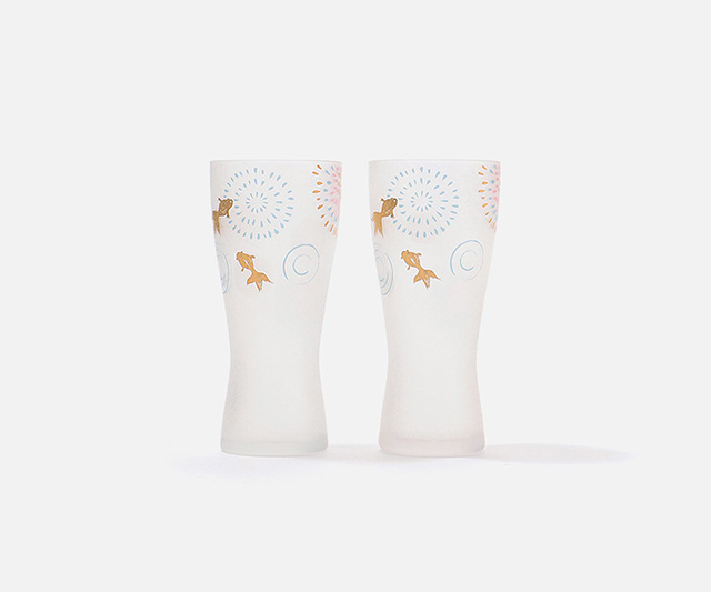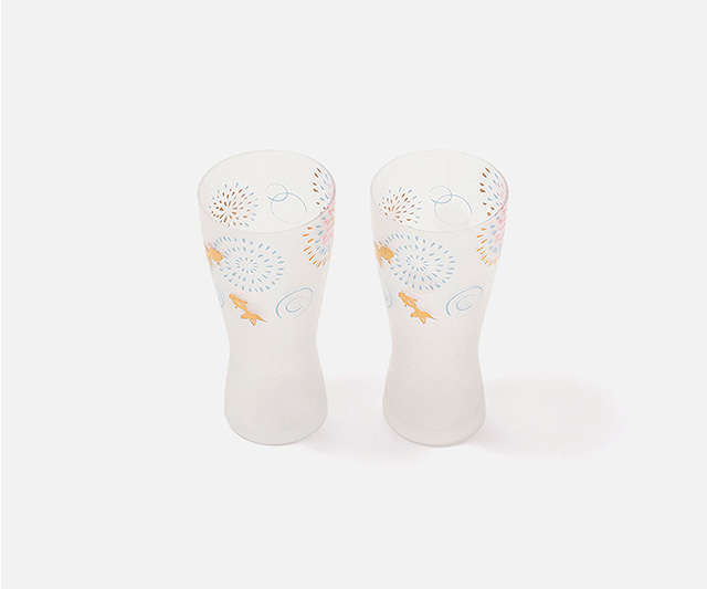 水面に映る「花火」が水紋と重なる様を描いた紋様、ビールグラスのペアセット、冷えたビールを注ぐと柔らかでクリーミーな泡ができやすいデザインです。
